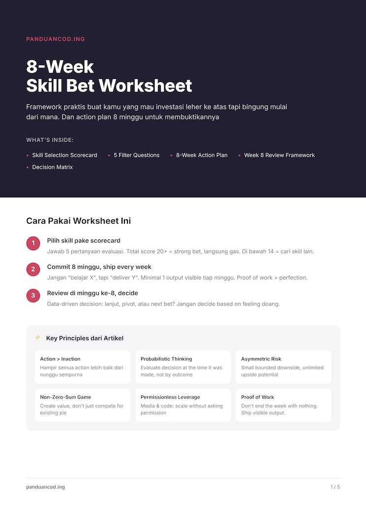 - Minggu 8: review. Tiga pertanyaan: 1) Apakah skill ini mulai membuka peluang income (job, freelance, project internal)? 2) Apakah gue cukup enjoy prosesnya untuk lanjut 6 bulan? 3) Apakah ada sinyal market (orang minta bantuan, ada feedback, ada demand)?